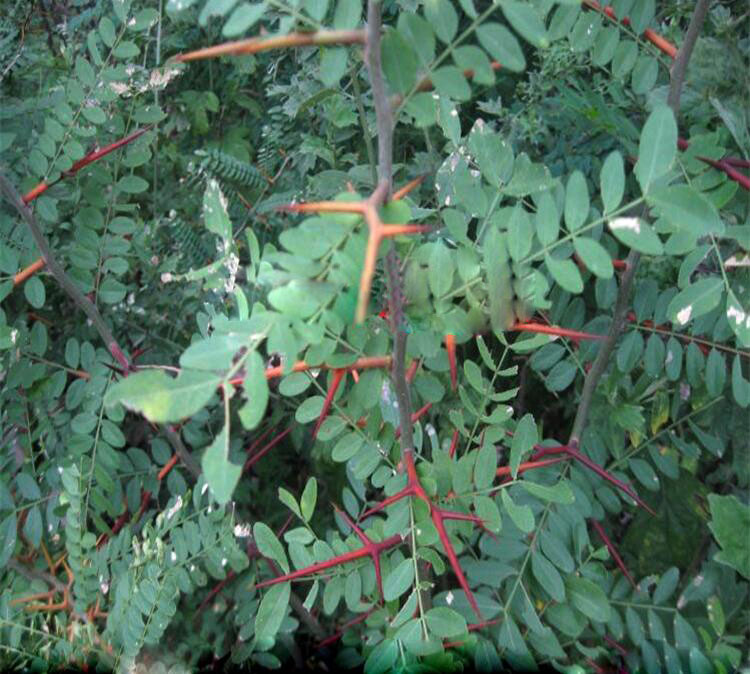 ? ? ? ?落葉喬木或小喬木,高可達30米;枝灰色至深褐色;刺粗壯,圓柱形,常分枝,多呈圓錐狀,長達16厘米,葉為一回羽狀復葉,長10-18(26)厘米;小葉(2)3-9對,紙質,卵狀披針形至長圓形,長2-8.5 (12.5)厘米,寬1-4(6)厘米,先端急尖或漸尖,頂端圓鈍,具小尖頭,基部圓形或楔形,有時稍歪斜,邊緣具細鋸齒,上面被短柔毛,下面中脈上稍被柔毛;網(wǎng)脈明顯,在兩面凸起;小葉柄長1-2(5)毫米,被短柔毛。