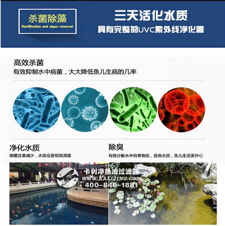 ? ? 3.殺菌系統——是魚一道保傘,能高效的阻止水中的有害細菌,避免魚類細菌的交叉感染、養魚先養水,水好了魚自然就不會生病,除掉水體內微藻 料的生長,解決魚池藻多水綠、褐色、灰色、保持水質清澈見底。